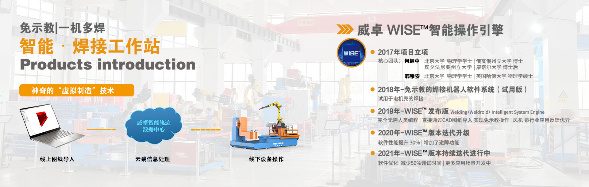 立即咨詢 現在聯系我們:0510-85384033無錫威卓智能機器人有限公司成立于2017年,是無錫市政府引進的科技領軍型高新技術企業,公司研發團隊80余人,我們堅持自主創新,利用自主開發的虛擬制造技術對傳統焊接行業進行升級改造。 公司主推的工業風機系列-智能焊接工作站產品,具有免示教、實時跟蹤、簡易工裝、傻瓜式操作等優點,真正幫助企業解決了招焊工難,用工成本高,焊接質量不穩定等問題。